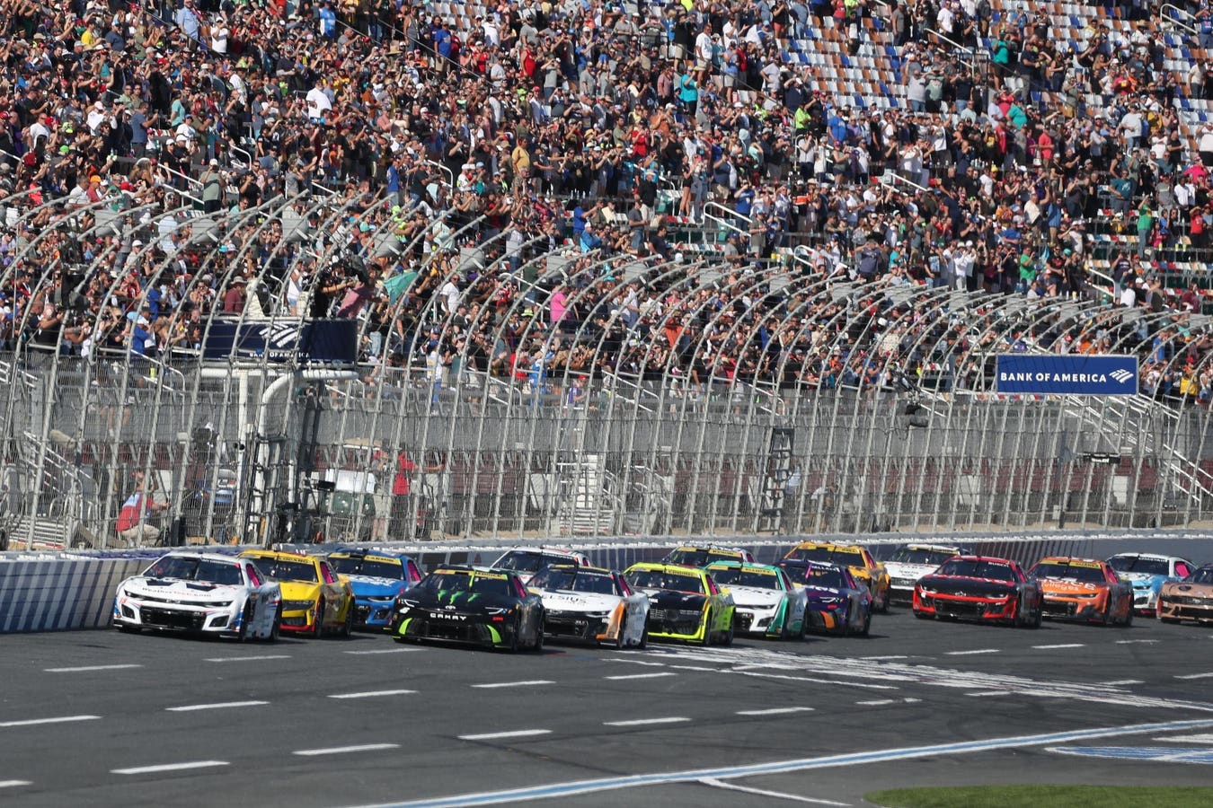 Shane Van Gisbergen (#13 Kaulig Racing WeatherTech Chevrolet) leads the field to the green flag during the running of the NASCAR Cup Series Bank of America ROVAL 400 on October 13, 2024 at Charlotte Motor Speedway in Charlotte, NC. (Photo by Jeff Robinson/Icon Sportswire via Getty Images)
