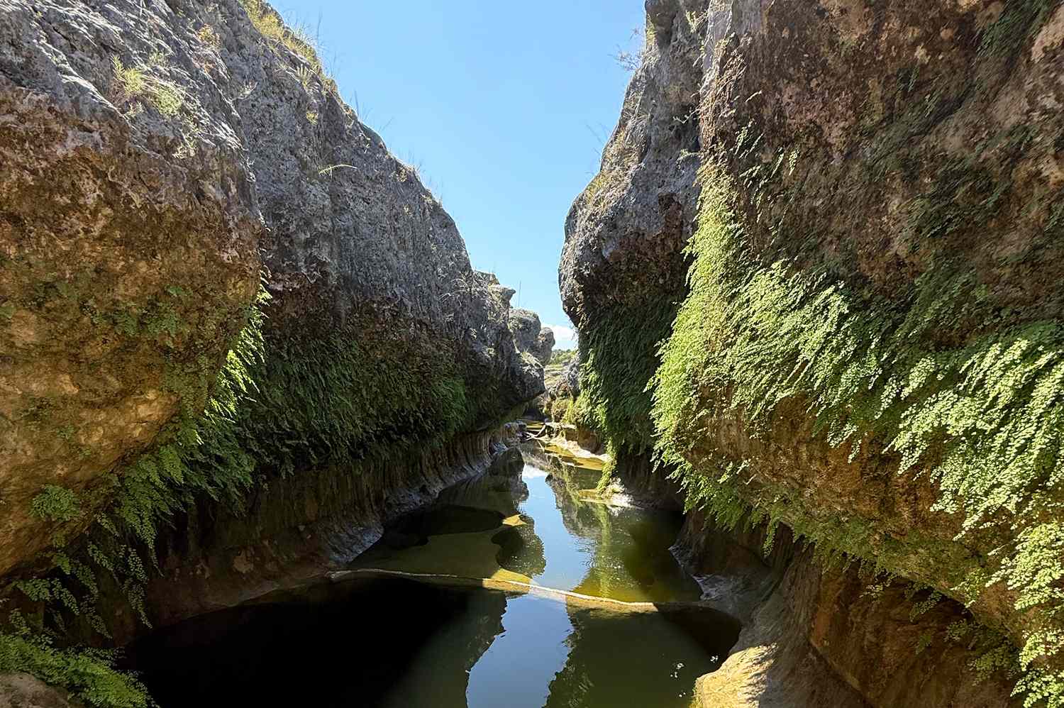 The Narrows extends for a quarter mile, and at times, the 40-foot-tall canyon walls are no more than 10 feet apart. Its lush fern-covered springs are a sharp contrast to the surrounding dry riverbed, and I wondered why the Blanco emerged from underground at this particular spot.